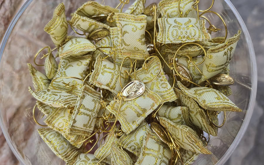 μεταλλική παραμάνα, μεταλλική οβάλ Παναγίτσα, υφασμάτινο φυλαχτό